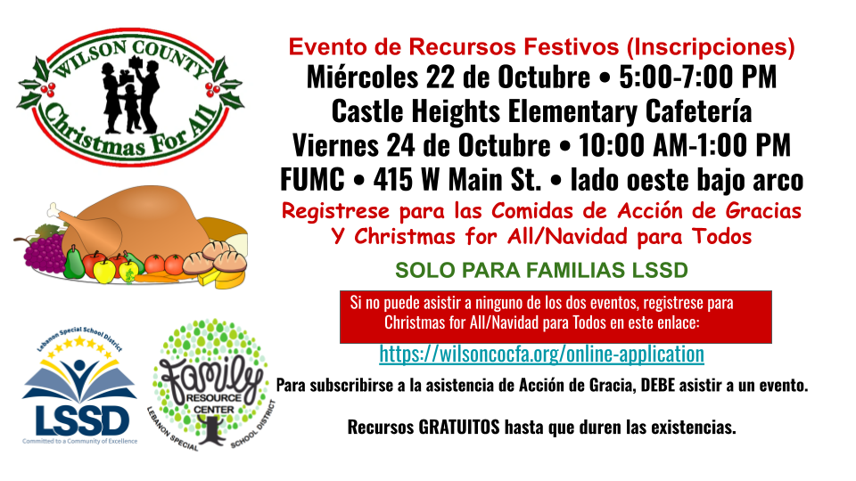 Evento de Recursos Festivos (Inscripciones) Registrese para las Comidas de Accion de Gracias y Christmas for All/Navidad para Todos