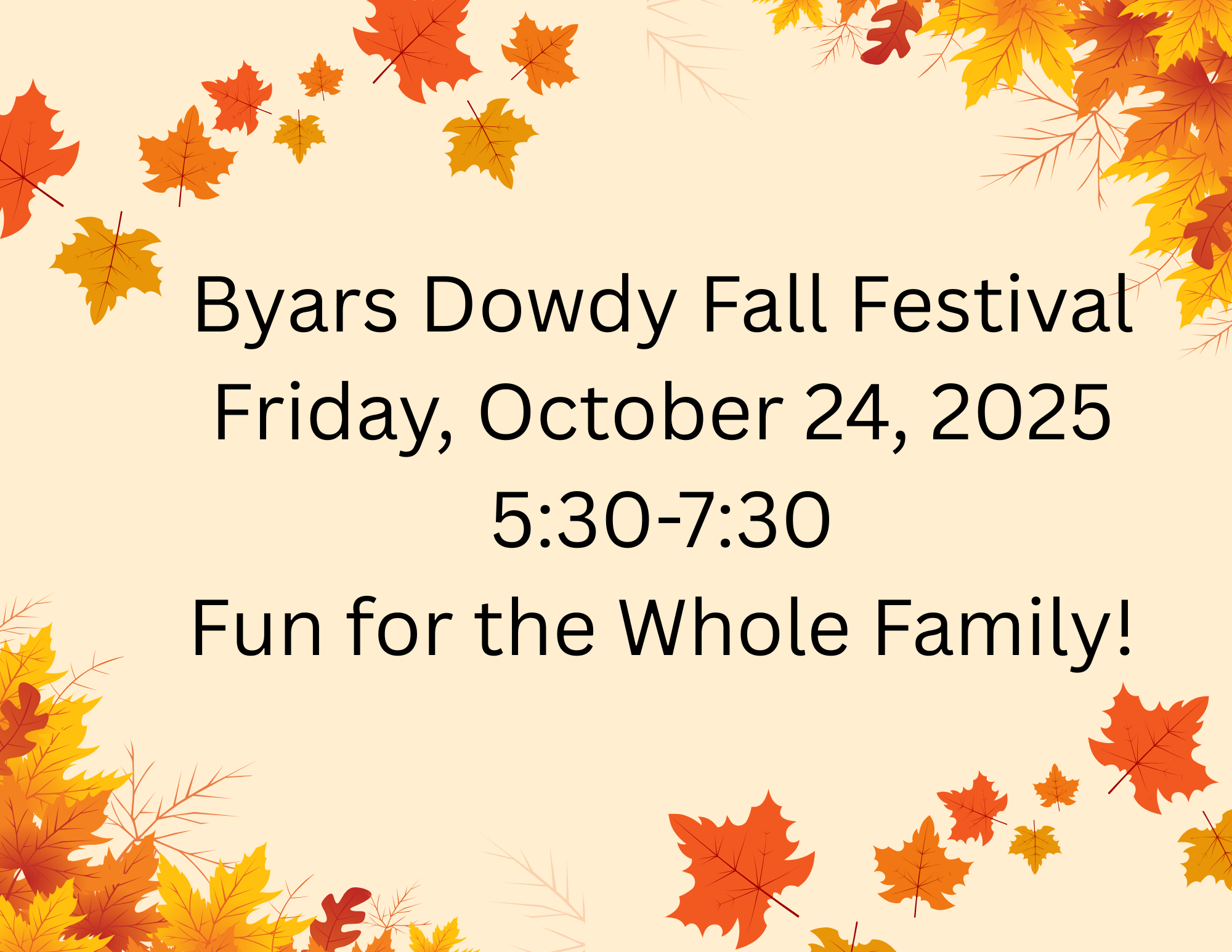 Fall Festival Byars Dowdy Elementary SchoolFall FestivalFriday, October 24, 20255:30-7:30Come Join the Fun!